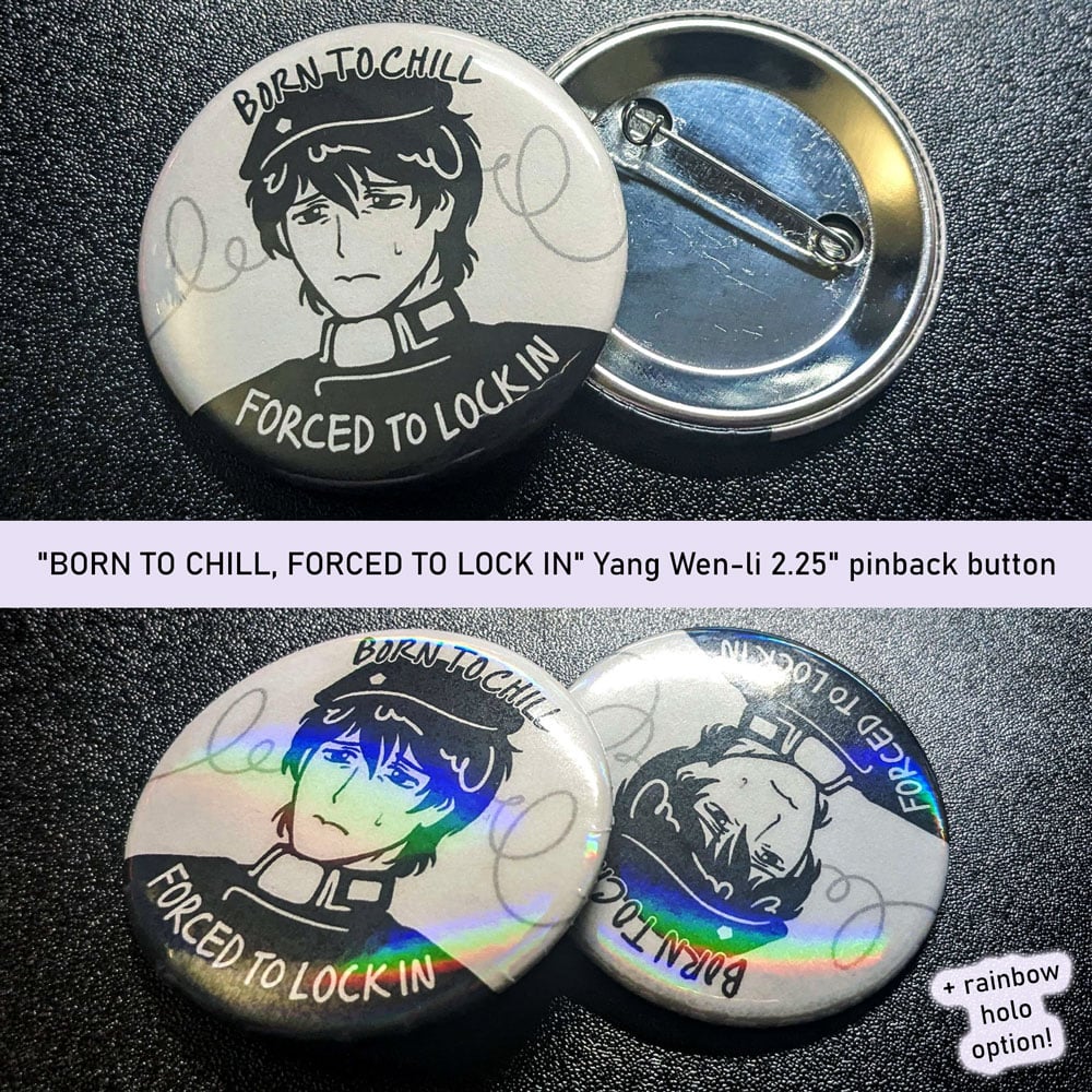 2.25 in / 5.5 cm diameter pinback badge you can select either a regular laminated finish or a shinier rainbow/holo finish!